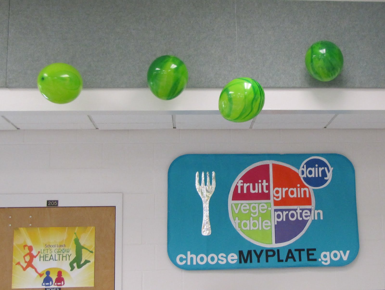 Balloon Tomatoe next to the bulliten board Salad Display. Makes eating heathly fun!