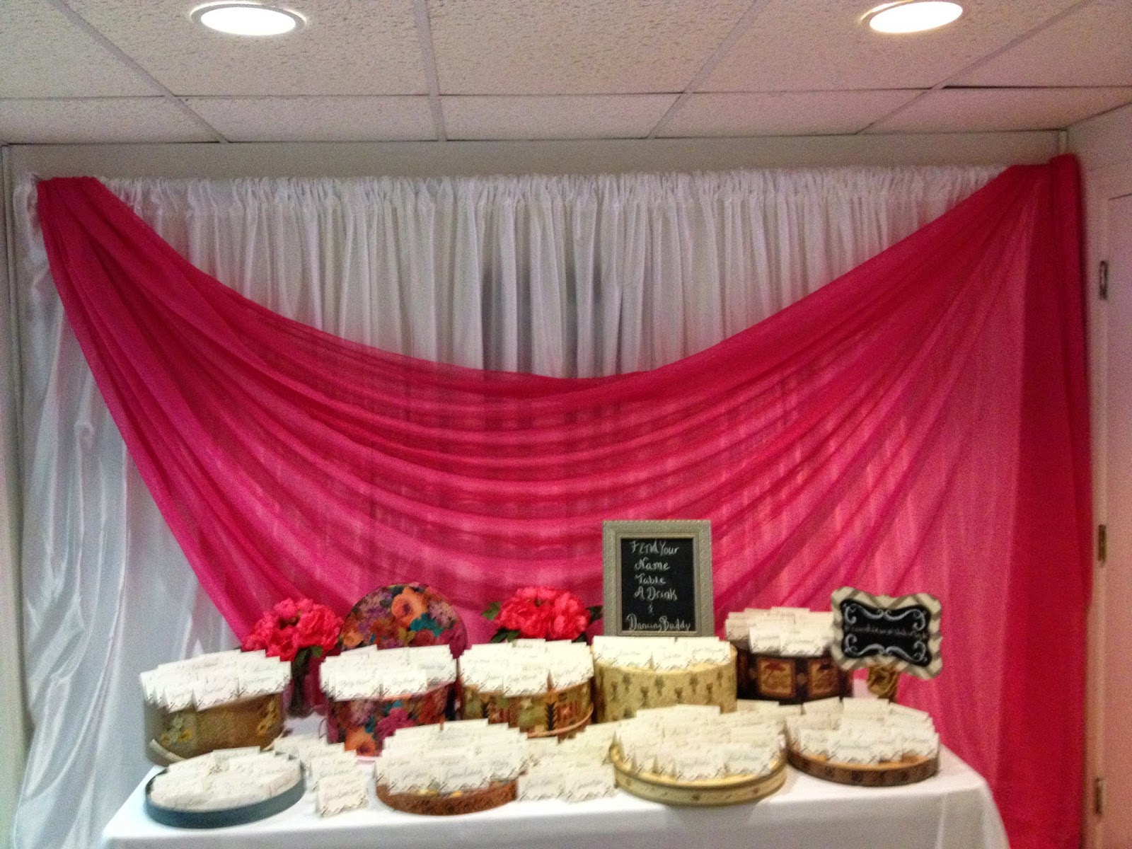 White and hot pink backdrop for the placecard table at entrance